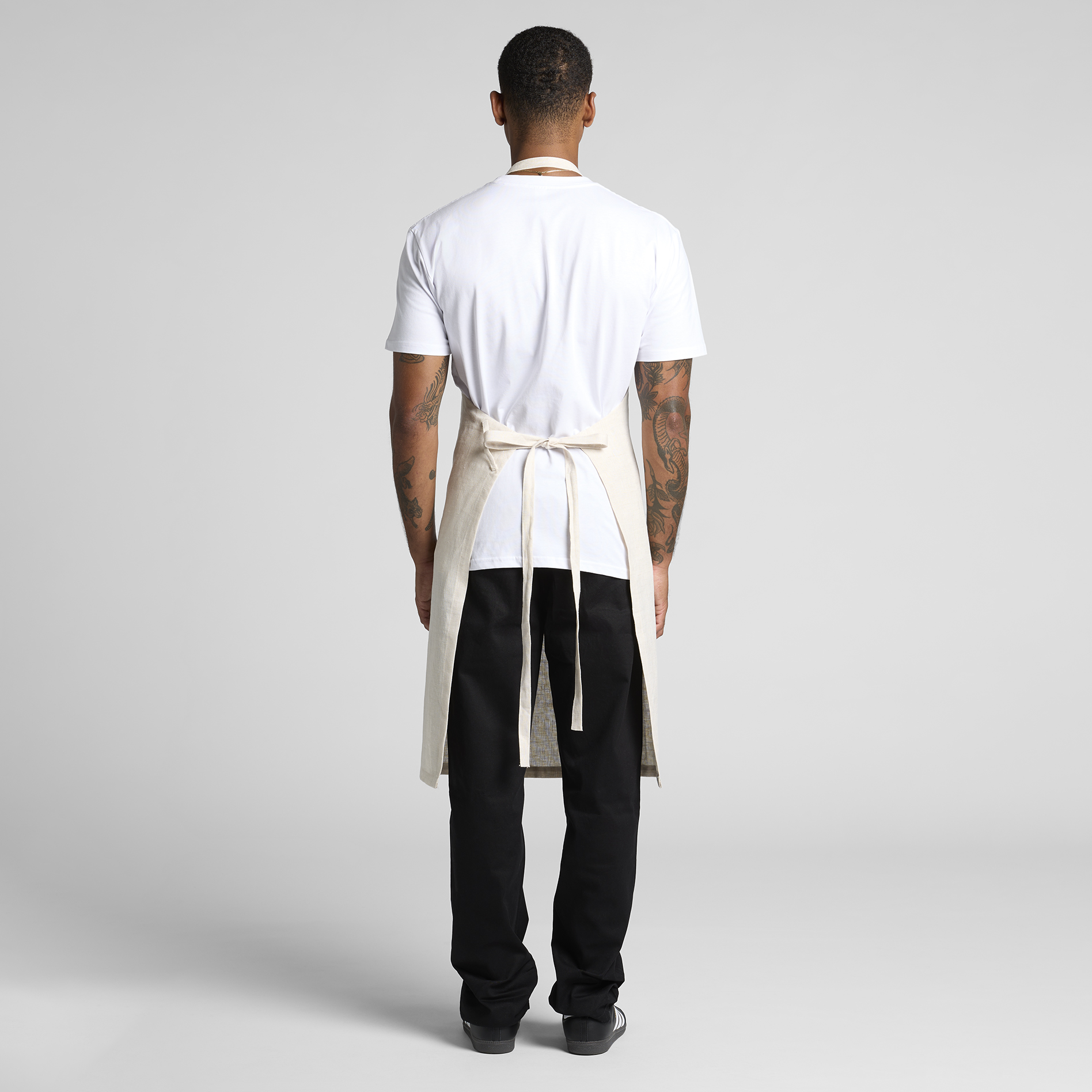 Construction: Adjustable shoulder strap, YKK metal strap adjuster, front patch pocket, self fabric waist and neck ties, top stitch detailing